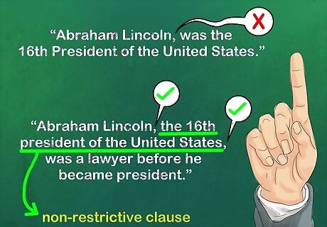 Do not always use a comma with a person’s name. This is another common comma error, but don’t be fooled: you only need to use a comma with the person’s name if the phrase serves as a non-restrictive modifier. For example, this is a common but incorrect comma usage: “Abraham Lincoln, was the 16th President of the United States.” Abraham Lincoln is the subject of that sentence and is an essential element. An example of correct comma usage with a name would look like this: “Abraham Lincoln, the 16th president of the United States, was a lawyer before he became president.” In this case, the 16th president of the United States is a non-restrictive clause (meaning the sentence makes sense if it’s removed) and is set off with commas on both sides.