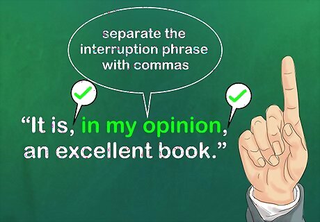 Use commas to offset expressions that interrupt the sentence. Sometimes, prepositional phrases and other phrases interrupt the main sentence, serving as non-restrictive modifiers. If these interruptions are separate from the main subject and verb, separate the interruption phrase with commas to signal to the reader that this information is inessential. For example, here is an example of a prepositional phrase acting as an interrupter: “It is, in my opinion, an excellent book.” This phrase isn’t crucial to the meaning, and can be taken out without damage to the sentence. Here is another example: “This road, on the other hand, is well-paved and easy to drive.” Direct address also falls into this category. For example, here is a sentence interrupted by a direct address to another person: “That's why I'm appointing you, Thomas, leader of the group.”