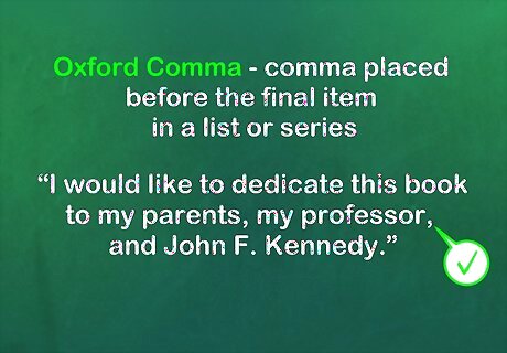 Understand the “Oxford Comma.” The Oxford comma (also known as the Harvard comma) is a comma placed before the final item in a list or series. It is the topic of some debate, with some people advocating against it and others insisting that it always be used. The goal of the Oxford comma is clarity, so use it when the last two items in your series should be clearly separated. For example, consider this sentence: “I would like to dedicate this book to my parents, my professor and John F. Kennedy.” With this punctuation, it looks as though your parents are your professor and John F. Kennedy. Using the Oxford comma will prevent this confusion: “I would like to dedicate this book to my parents, my professor, and John F. Kennedy.” Using an Oxford comma will never be grammatically incorrect, so if you’re unsure whether you need it, use it anyway.