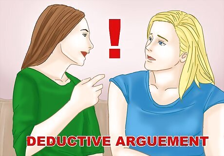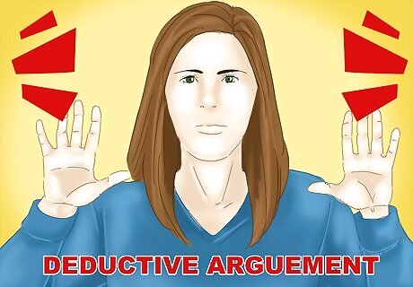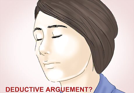 Understand the deductive argument. When you use a deductive argument, you are trying to prove an argument is valid by showing that the argument’s assumptions are true. The premise of the argument needs to seem strong enough to support a specific conclusion. If the premise of the argument rings true, the argument can be proven as sound or logically correct. For example, you may notice that it’s sunny outside when you wake up. You may then deduce that your husband left the house without an umbrella and not wearing a raincoat. You can then make a deductive argument that your husband will come home without an umbrella and in a sports coat, not a raincoat. Based on an analysis of the premise, you can form a deductive argument and make an assumption that has a high likelihood of being correct. A deductive argument focuses on making a guaranteed conclusion, where the truth of the conclusion is highly probable. The argument should contain a truth that is implied by the premise. You can conclude your husband is not carrying an umbrella when he gets home, for example, because the premise (sunny skies) implies the truth of your argument or conclusion.