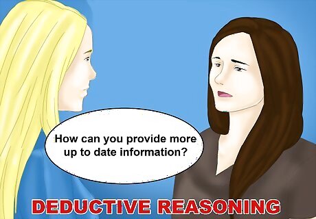 Address a client issue with deductive reasoning. You can apply deductive reasoning in a situation with a client that goes sideways, especially if the client is very logic focused. Deductive reasoning is useful for businesses who are trying to come up with practical solutions to problems or issues. However, it is important that you gather enough supporting information from your client to ensure the solution or deductive argument is based on a solid premise. For example, your client may have an issue with the way you are communicating with her. She may complain that she does not feel she is kept up to date on the status of the project you are both working on. You can then ask your client several general questions: How can you provide more up to date information? In what ways can you make the client feel more connected? What information would she like to be made aware of in relation to the project? Your client may note that she would like status reports every week. Based on the client’s answers, you can form a premise: weekly status reports will keep your client happy. You can then deduce that weekly status reports will ensure your client is up to date on the status of the project. You can apply this deductive argument by providing your client with weekly status reports. The deductive argument has a high probability of being effective, as it is based on a logical and supported premise.