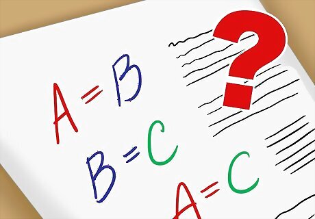Solve a math problem with a deductive argument. In mathematics, deductive reasoning can be used to formulate the answer to a mathematical problem. The more complex the mathematical problem is, the more complex your deductive argument (or proof) will need to be. In the most basic form, a deductive argument in mathematics could be represented by: If A=B and B=C, then A=C. This means that you make a general argument: A=B. You then note a more specific argument: B=C. You can then deduce the following argument or proof: A=C.