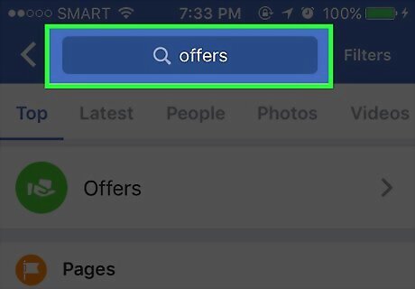 Click “Offers” in the search results. It has a round green icon and says “Facebook” beneath its name. A list of your saved Offers will appear.