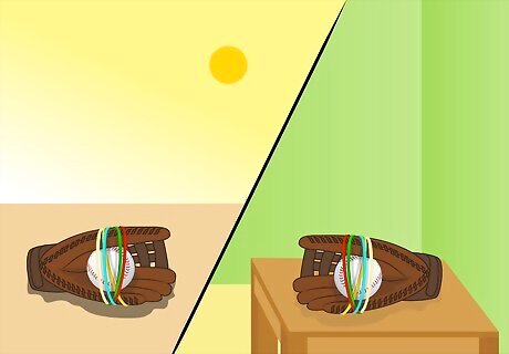 Break in a glove by wrapping rubber bands around it. Break in your baseball glove by putting a ball in the glove and wrapping multiple rubber bands around it. The rubber bands should be tight enough that the ball will not fall out of the glove. Leave the glove in direct sunlight for a couple of hours, then take the glove out of the sun, take off the rubber bands and put the glove on. Open and close the glove a few times and throw the ball in the glove a few times. Put the ball back in the glove, wrap it back up with rubber bands, and store the glove in a cool, dry place for a few days. Your glove should then be ready for action.