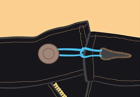 Loop a rubber band around the button and buttonhole of your pants for makeshift maternity clothes. If you’re pregnant and not quite big enough to fit into maternity clothes, wrap a rubber band around the button on your jeans, through the buttonhole, and back onto the button. Doing this will lengthen the width of your jeans and prevent you from having to purchase new jeans. As the pregnancy progresses and the belly size increases, try using larger or more elastic rubber bands.