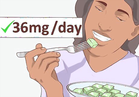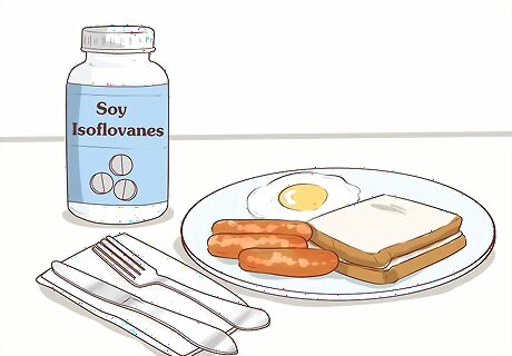 Aim for 36 milligrams of soy isoflavones per day. Each gram of unprocessed soy protein provides 3 to 4 grams of isoflavones. In other words, you should aim to consume roughly 9-12 grams of soy protein per day. If you don’t want to worry about specifics, simply including an unprocessed source of soy protein in your diet 3-4 times per week should help you meet these marks. You can try eating miso, tempeh, tofu, or edamame to get your 36 milligrams.