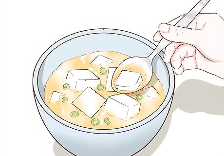 Eat miso. Miso is a fermented paste created from soybeans, and it is one of the healthiest and easiest ways to consume beneficial soy isoflavones. Miso can be used in place of (or in addition to) stock or bouillon. It can be used in dressings, gravies, and other sauces. The most popular way to consume miso is to make a pot of miso soup. Miso can be found at health food stores and Asian markets. Always read ingredient labels. Avoid miso that contains MSG (monosodium glutamate).