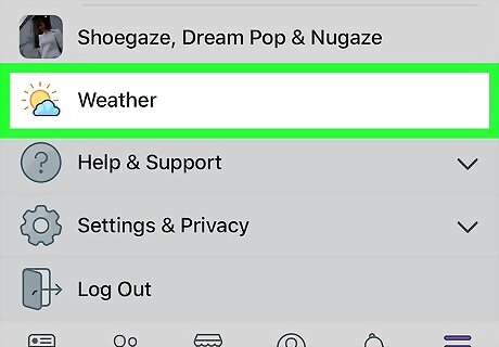 Scroll down and tap Weather. Look for the light-blue icon with a cloud. This opens Facebook's Weather app, where you'll find the weather conditions for your area.