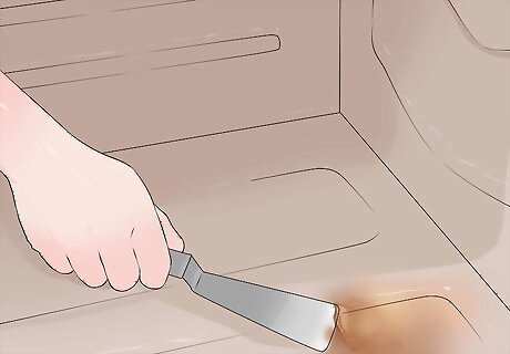 Scrape off large food residue. Assist in the success of the cleaning cycle by scraping at large food stains to loosen them. This will make the resulting ash easier to remove later. Use a kitchen tool with a straight edge to gently scrape away dried-on food. However, avoid very sharp edges, as this could scratch away the pyrolytic coating over time. Don’t worry about getting all of the food stains scraped completely away. The goal is not to remove all of the material, just to help loosen it before the self-clean cycle.