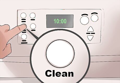 Locate and engage the clean button. Find the button or setting within your oven’s control panel or knobs that says “Clean” or “Self-Clean.” Engage this function to begin the cycle. Depending on your oven model, you may need to select a time period to run the cleaning cycle. Typically a full cycle runs between 2 and 4 hours to fully heat up to 800°F to 1000°F and then cool all the way back down. For some models, you can only use one setting, such as 4 hours. For safety, your oven model may also automatically lock the door of your oven for the duration of the cleaning cycle.