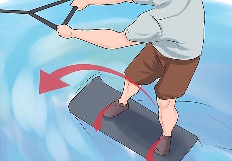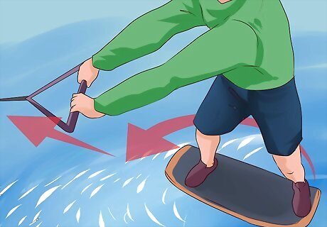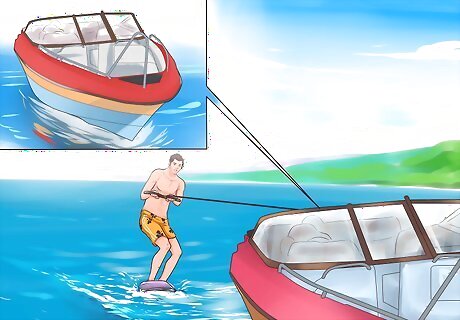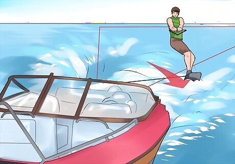 Turn the board so that your dominant foot is towards the boat. Put pressure on your back foot (the left, if you are right-footed/goofy rider) to turn the board so that it is parallel to the boat.