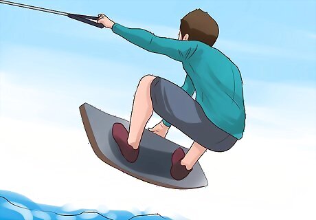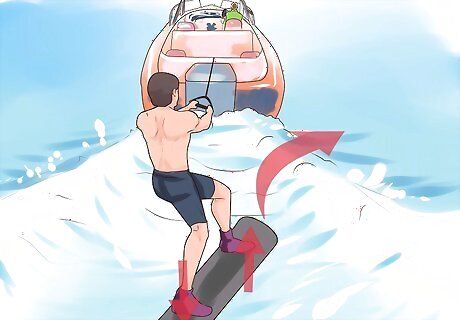 Use the edge of the wake like a ramp to get some air. Once you're comfortable turning it is time to get some air. Get outside of the wake then turn quickly back towards it. Put light pressure on your back foot to push the nose in the air and keep your knees bent as you hit the wake, popping you into the air. Slightly extend your legs so that you can bend your knees on the landing, much like you would after jumping off a high ledge. Pull the rope in 2–3 inches (5.1–7.6 cm) to keep it tight as you start the jump.