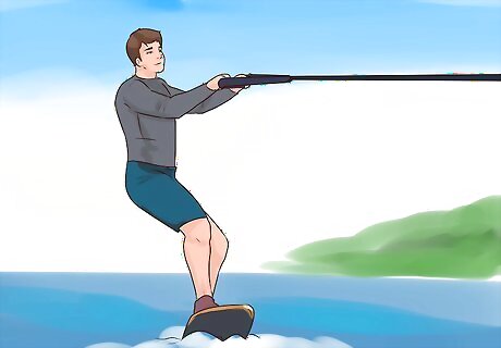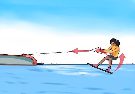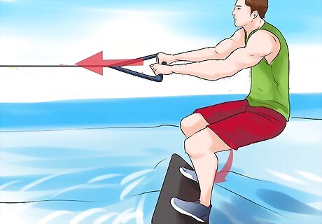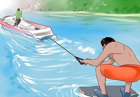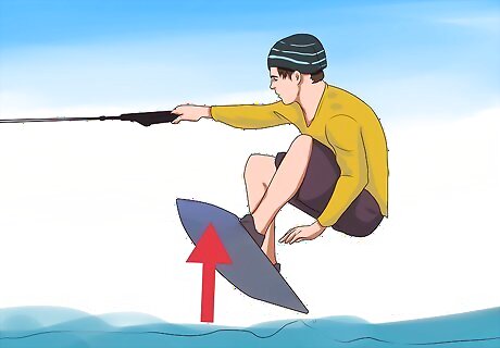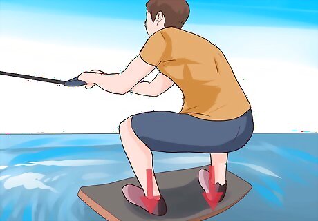 Let the boat pull you up as it gains speed. This takes some practice, but once you get a feel for the balance it is actually not too difficult. Once the board is comfortably on your feet and the line is taut, slowly stand up on the board. With your knees relaxed, keep your hands out in front and unbend your knees as you let the boat pull you to a standing position. The boat should be going 13-16mph. Don't lock your knees -- they should still be slightly bent as you stand up in an athletic position.