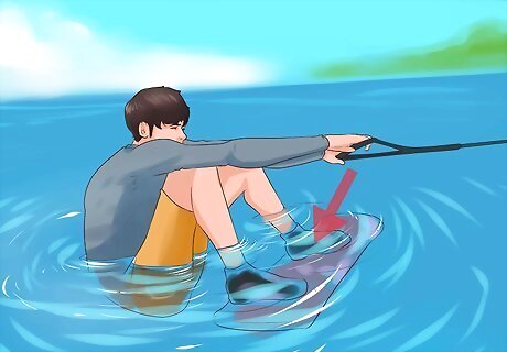 Sit in the water with the board by your feet. Before you tell the boat to get moving, get comfortable in this seated position. Your butt should be the lowest point, with your lifejacket keeping your head and torso above the water. The board will be perpendicular to the boat. If you are right-footed, the front of the board faces to the right. This is also known as "goofy" stance, or "goofy-footed." If you are left-footed, the front of the board faces to the left. This is a standard, or regular, stance.