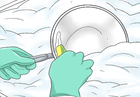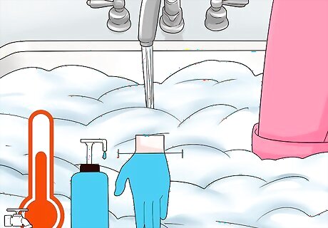 Fill the sink with hot soapy water. Turn on the water to a temperature that is hot, but comfortable to the touch. Put a small amount of dish soap in the sink. Place the tips of your fingers on the bottom of the sink with your hand straight up and down. Fill the sink until the water reaches the base of your wrist. The water should be no deeper than one hand’s length.