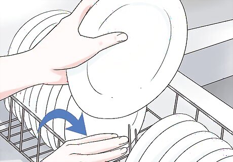 Put away clean dishes. Before you begin washing dirty dishes, you will want to make sure that the clean, dry dishes are put away. Use your hands to locate clean dishes on the drying rack or mat. Then place the dishes in their appropriate cabinets. You can make putting dishes away easier by placing Braille labels on corresponding shelves and drawers.