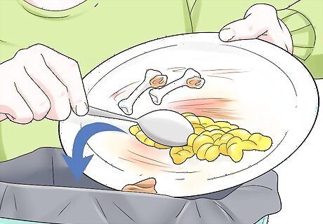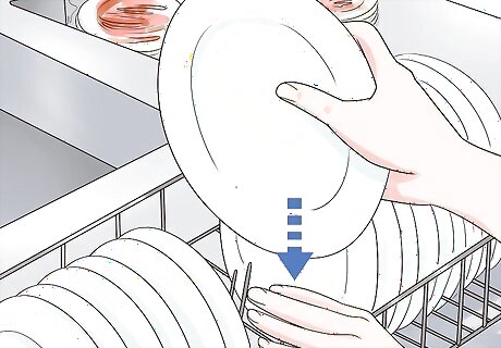 Scrape the food from the dirty dishes. Before you attempt to wash dishes by hand or in a dishwasher, you should gently scrape all the food from the dishes. You can scrape the food directly into a trashcan or, if you compost, into the compost bin. Use your hands to feel for any remaining food on the dishes after you have scraped them. If you feel any leftover food, use a utensil or your hands to scrape it into the trash.