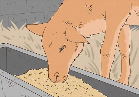 Precondition the calves. Creep-feed (or precondition) the calves so that they learn to eat from a feed bunk before being weaned. Preconditioning calves is a great method to adopt to reduce stress for calves at weaning time. Preconditioning involves getting calves used to eating out of a feed bunk or trough, and drinking from a water trough. This should be done without the cows around, as cows tend to be more pushy and bossy around the feed bunk and water trough, not allowing the calves in at all. Use of a creep-feeder is best to get the calves used to eating out of a feed bunk. A creep feed or precondition ration for calves should include a mix of grain silage (corn, sorghum, barley, wheat or oats) and legume-hay, plus a concentrate supplement that includes protein. Make sure the supplement you are giving them does not have animal by-products in it at all, as this could be serious if one or some of the calves develop symptoms of BSE when they get older (especially in those heifers that will be used as cows.)Also, keep the feed free of mold and dust, as this will cause calves to get sick with illnesses like pneumonia.