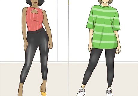 Match the texture of the leggings to your outfit. Leggings come in both matte and shiny textures. Shiny leggings look more dressy, so you might want to pair them with a dressy top and some heels. They will help make your legs look longer. You can also pair them with some fancy flats. Matte leggings look more casual, and are best paired with a loose-fitting shirt.