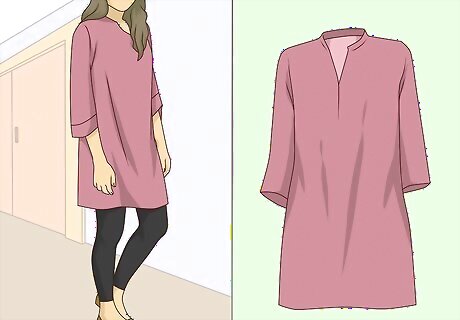 Wear a flowing, boho-style blouse with a belt for a more girly look. Make sure that the blouse extends past your hips and covers your bottom, especially if your leggings are sheer. Finish off the look with a delicate necklace or bracelet. The belt will help cinch in your waist, and make your outfit look less baggy.
