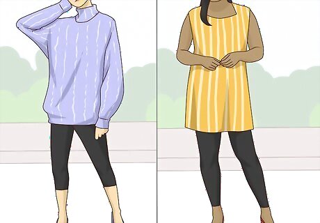 Pair leggings with a longer top. Ideally, the hem of your top should come down to your mid-thigh. Avoid anything too form-fitting, however; a loose-fitting top will add contrast to a pair of tight-fitting leggings, and will make your outfit look more interesting. If you want to show some skin, try pairing your leggings with a crop top, an oversized shacket, and lug sole boots. In cold weather, wear your leggings with cozy cold-weather boots and a shearling coat.