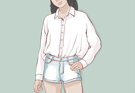 Add a crisp white shirt for a classic look. Blue denim looks great against a white shirt. Use a crisp blouse to accentuate your jean shorts. Tuck in your shirt to accentuate your waist, or let it hang freely for a more relaxed outfit. Use a button-down white shirt to create a faux-preppy look.