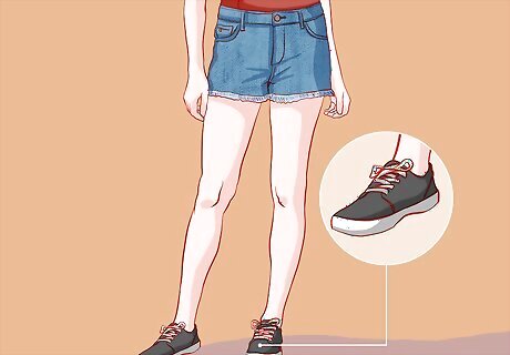 Create a sporty look with running shoes and jean shorts. If you’re going to be walking a lot in your jean shorts or you want to be comfortable, pair your shorts with some running shoes. Choose ones that go with the top or jacket you are wearing. Put on some ankle socks to complete this look. Running shoes and a bomber jacket go great together. Combine a plain T-shirt and running shoes with jean shorts for a laid-back outfit. Gray or black running shoes go with almost any color.