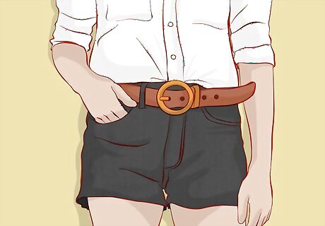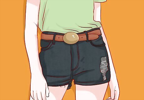 Wear a large belt buckle to draw attention to your shorts. Find a belt that has a big metal belt buckle with a design that you like and wear that with your jean shorts. Tuck the front of your shirt in to make the buckle stand out. Large belt buckles look the best with black or light-wash denim. Support your favorite sports team with your belt buckle, or get patriotic with a bald eagle.