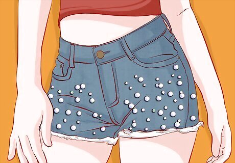 Use embellished jean shorts to show off your style. Denim is a very versatile fabric, and it can be embellished with jewels, embroidery, or even patches. If you want to stand out, add some bling to your shorts with a design or patch that lets people know who you are. Add a patch or two to keep it simple, or look for jean shorts with a design on the back pockets to stand out. You can add patches to your jean shorts yourself if they are iron-on ones. Simply place your patches where you want them on your shorts and swipe a hot iron over them 2 to 3 times.