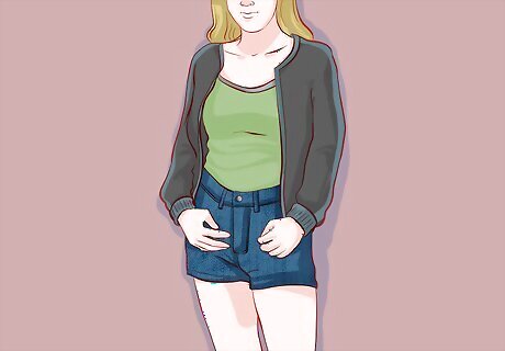 Define your waist with a light bomber jacket. Bomber jackets hit right below your natural waistline. This draws attention to your hips and your waist without elongating your torso in any way. Choose a bomber jacket on a chilly summer night to look great while keeping warm.Tip: Avoid wearing long cardigans that go beyond the length of your shorts. This can make it look like you aren’t wearing any bottoms at all. Be bold with an animal print bomber jacket, or keep it neutral with a solid color.