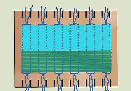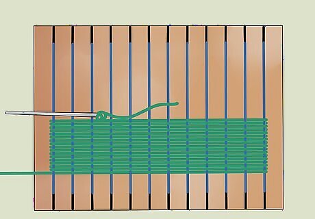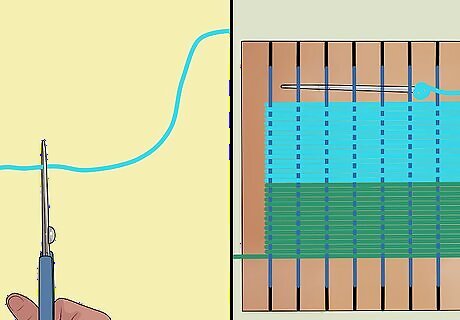 Cut a new piece of hemp yarn and weave it under and over the weft. The yarn should be about 2 feet (0.61 m) long. It can be the same color as your last piece of yarn, or a different color if you want to create a striped pattern. Follow the same process you used to weave the first piece of yarn—thread it through the needle, then weave it over and under, over and under the weft. Repeat this process until the loom is full. Trim any remaining weft yarn so there’s a 3 inches (7.6 cm) tail sticking out one side.