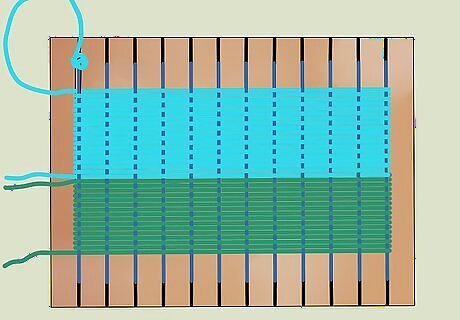 Weave this yarn under the first warp on the left and over the second. Continue to weave the yarn under and over, under and over until you get to the far right side of the loom. This horizontal yarn is known as the weft. Once you’ve finished weaving, pull the weft yarn through until there’s a 3 inches (7.6 cm) tail on the left side.