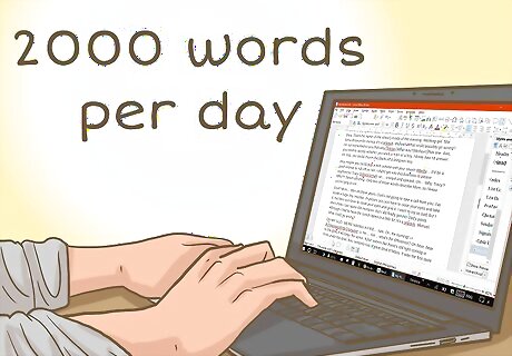 Establish a daily word goal. To win NaNoWriMo, you should be writing every day. You must write at least 1,667 words a day to win. That said, you should aim for a higher word count. Try to establish a daily goal of at least 2,000 words. This way, if you must miss a day, you will not fall as far behind as you would have otherwise. To find your word count in Microsoft Word, look on the status bar that runs along the bottom of the document. The word count is between the page number and the language setting. You can also click the tab on the toolbar called "Review." A button that says "Word Count" should appear. For Google Docs, go to the tools section and you will find a word count button. You could also just use the keyboard shortcut "ctrl+shift+c". There are also many online word counters, but many of these do not save. If you are using the Young Writers Program, there is a built-in word counter. Two thousand words is roughly four typed single-spaced pages.
