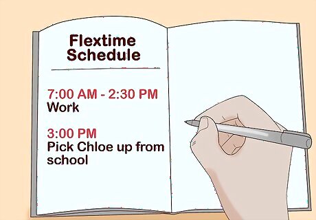 Address your desires and present potential concerns. Explain why you want to change from a traditional schedule to a flextime schedule. Be honest about your work-life balance and how working a nontraditional schedule will help make you a happier and more productive employee. For example, if your employer counts on you to open up the office every day, and you want to start working from 10 am to 6 pm, you could propose training another employee to take over that responsibility.