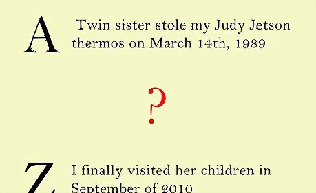Have an A and Z. That is, have a straight up, no fuss, no muss, beginning and end before you start writing your story. If your twin sister stole your Judy Jetson thermos on March 14th, 1989 and you finally visited her children in September of 2010, there it is. There's your story. Now you just have to fill in the gaps. Remember: The story is all yours. Whatever happened can be as insane or as mundane as you see fit; if you write it compellingly, your readers will care (in a good way) either way.