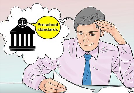 Review the state standards for preschool. Local governments usually have set standards for each age group. Standards are often divided into subject areas like mathematics or social studies. Within each subject area, students have to meet certain performance standards to show that they have made acceptable progress. They are generally skills-based objectives that explain what students should be able to do without going into detail about content.