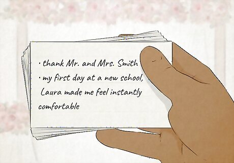 Write notes containing key phrases, not the whole speech. Don't just take a copy of your whole speech up to the podium with you—you'll spend most of the speech looking down at the paper instead of engaging with the audience. Instead, write down a series of phrases that will help keep you on track while you're giving your speech. As you're speaking, hold your notes down so you can still make eye contact with the couple and the audience.