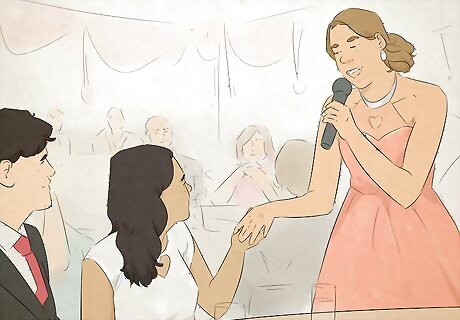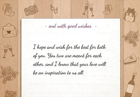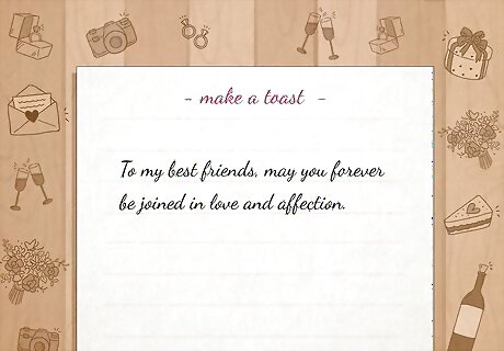 Make a toast to the couple. After you finish your speech, raise your glass. Ask everyone to join you in toasting the couple and their marriage. A toast can be as simple as “To the couple!” or more elaborate, such as, “To my best friends, may you forever be joined in love and affection.”