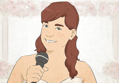 Speak slowly in a loud, clear voice. Make sure you speak loudly enough for everyone to hear you. You may or may not have a microphone during your speech. Regardless, speak loud enough for everyone to hear. Say your words a little more slowly than you would normally speak so everyone will be able to hear you. Enunciate clearly, and take a breath between each sentence. If you're speaking into a microphone, hold it about ⁄3 in (0.85 cm) away from your lips, and use your normal speaking voice. If you don't have a microphone, you may need to speak much more loudly than normal. If you start to cry, stop and take a deep breath. Dab away your tears, and begin again when your voice is steady. While crying is natural at a wedding, it can make you difficult to understand while speaking.