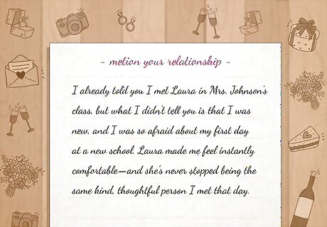 Talk about your relationship with your friend. Now, you're ready to talk about how you know the couple. Start by talking about the person you're closest to. Share a special memory, like how you met or a story that illustrates what your friendship is like. Don't be afraid to get sentimental, although it's okay to be funny, if you prefer. For instance, you might say something like, "I already told you I met Laura in Mrs. Johnson's class, but what I didn't tell you is that I was new, and I was so afraid about my first day at a new school. Laura made me feel instantly comfortable—and she's never stopped being the same kind, thoughtful person I met that day." To keep the focus on the couple rather than yourself, limit how much you say things like "I" and "me."