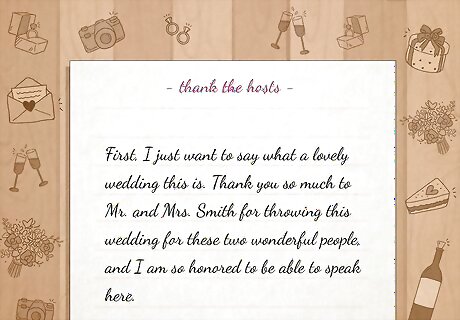 Thank the planners and hosts. After you introduce yourself, take a moment to thank the wedding planners, couple, or the couple’s parents for hosting the wedding. You might also thank any other family, friends, or members of the wedding party who helped with the planning process. This is also a good time to state how grateful and happy you are to be there. For example, you can say, “First, I just want to say what a lovely wedding this is. Thank you so much to Mr. and Mrs. Smith for throwing this wedding for these two wonderful people, and I am so honored to be able to speak here.”