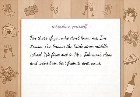 Open by introducing yourself. Don't just assume everyone at the wedding knows who you are—some distance relatives and friends will probably benefit from a brief introduction. Start by telling the wedding guests who you are, including your name, and a little about your relationship to the couple. For instance, you might say, “For those of you who don’t know me, I’m Laura. I’ve known the bride since middle school. We first met in Mrs. Johnson’s class, and we’ve been best friends ever since.”