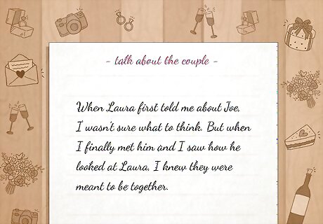 Move into talking about the couple. Next, share a little about how your friend met the person they're marrying. Talk about things like your first impressions of your friend's partner, how you knew they were meant together, or a funny story about something the 3 of you did together. For instance, you might say, "When Laura first told me about Joe, I wasn't sure what to think. But when I finally met him and I saw how he looked at Laura, I knew they were meant to be together." Avoid choosing memories that might be embarrassing for the couple, and try not to include any inside jokes that might only be funny to a few people in the crowd.