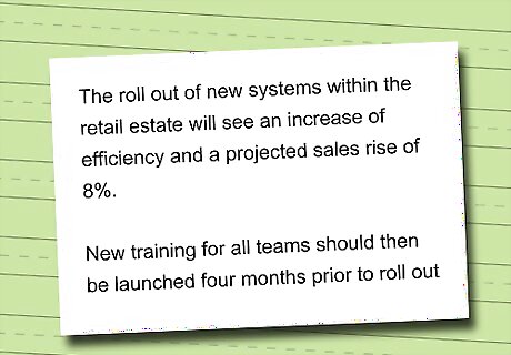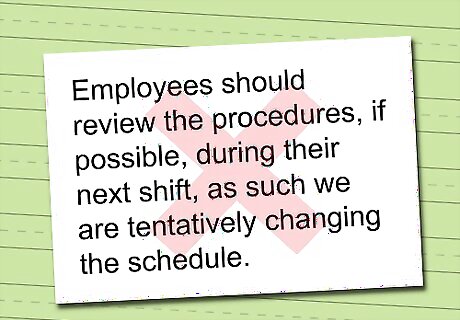 Talk about action, and don't weaken statements with qualifiers. Don't write "employees should review the procedures, if possible, during their next shift" or "we are tentatively changing the schedule," because these statements aren't clear that the employees are required to review the procedure or that they can argue against the change in schedule. Make unqualified statements like, "review the procedure" and "we have changed the schedule."
