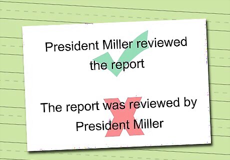 Write in active voice unless it's important to disguise who took the action. Strive to structure your sentence so the person or thing that takes the action appears at the beginning. The sentence "President Miller reviewed the report" is in active voice. "The report was reviewed by President Miller" is in passive voice. Disguise who took the action with passive voice when necessary. For instance, if you want to inform readers of a mistake but don't want to blame a specific person for it, you might write "a mistake was made in the closing procedure."