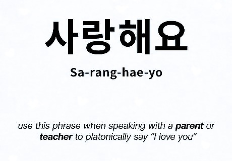 Sa-rang-hap-ni-da (사랑합니다)While still a version of the “sa-rang-ha-da” verb, sa-rang-hap-ni-da is far more formal than “sa-rang-hae” or “sa-rang-hae-yo.” You only use this phrase when speaking to someone in a significantly higher social rank than you, like a grandparent or your employer. Just like with “sa-rang-hae-yo,” add the “ssi” (씨) suffix when referring to someone by their name. “Sa-rang-hap-ni-da, hal-meo-ni” (사랑합니다, 할머니) translates to “I love you, grandma.” “Sa-rang-hap-ni-da, Ji-yun-ssi” (사랑합니다, 지윤씨) translates to “I love you, Jiyoon.” Learn romantic phrases for real conversations. "I wanted to learn Korean, so I could talk to my girlfriend in a more heartfelt way. The article gave me actual romantic phrases I can use, not just stiff textbook sentences. Now, I can say things like "I miss you" or "I can't live without you" in a way that sounds natural but still romantic. It really brings us closer when I can express my feelings in her native language." - Peter T. Tailor your speech to show respect. "I used to feel awkward talking to my Korean girlfriend's parents since I didn't know the right level of formality to use. This article explained how speaking casually to your friends is different than talking politely to parents and elders. Knowing when to use formal phrases helps me make a good impression on her family and show respect." - John Kervy B. Practice pronouncing loving words. "As someone just starting to learn Korean, I found the tips on how to pronounce "I love you" super helpful. I was able to practice saying the phrases out loud, thanks to the breakdown of the sounds. My speaking skills have definitely improved from repeating these loving words until I get the pronunciation just right." - Joyce S. Use pet names for sweetness. "I loved learning classic Korean pet names to call my partner. Sprinkling in words like "jagiya" (baby) and "nae sarang" (my love) adds some cute romance to our daily conversations. It's a simple way to surprise him and keep things feeling sweet." - Kitty B. Did you know that wikiHow has collected over 365,000 reader stories since it started in 2005? We’d love to hear from you! Share your story here.